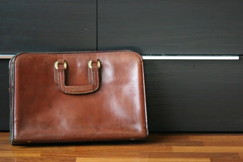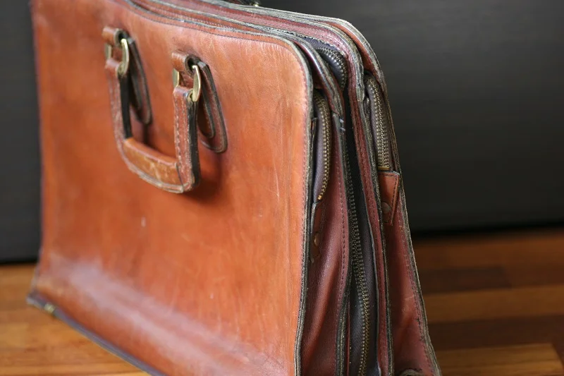 At local flea market I found the exact style leather bag I had been searching for, a small and light briefcase-style portfolio bag, just large enough for my laptop and notepads. A troubled and abused looking bag, the leather appeared to be scarred with scratches, stains and smudges- a true gem in the rough. I inspected the quality of the leather, the zippers- everything seemed in order. Although I didn’t recognize the brand, I knew that it was a high quality case and was hoping to wheel and deal it for around $100.